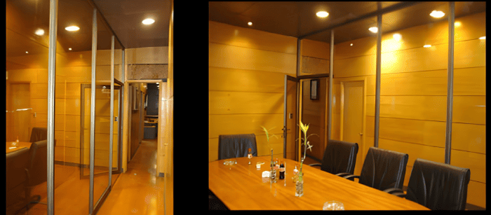 Sala de Reuniones Proquiel Ltda. equipada con un tabique vidriado confeccionado en perfilería de aluminio color titanio.
