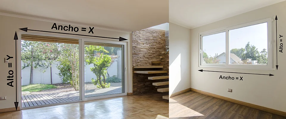 (ancho de la ventana actual, incluyendo el marco) y desde el antepecho o suelo hasta el techo (alto de la ventana).